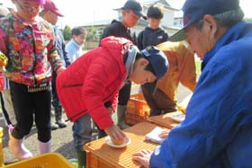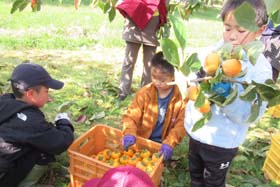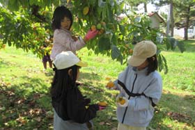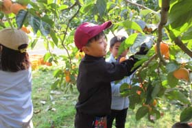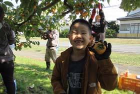 老人クラブの方々と一緒に、柿もぎをしました。教えていただいたとおり、実をくるくる回すと簡単にとれるので、たくさん収穫することができました。(2025.11.29)