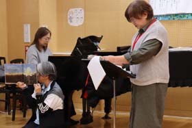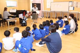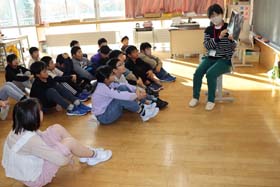 11月のお話タイムは、音楽室で読み聞かせとピアノ演奏のコラボを体験した学年もあります。静かに聞き入っています。(2025.11.06)