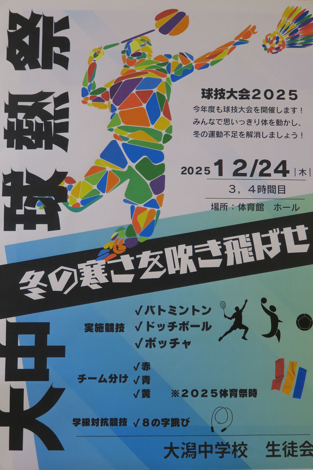 生徒会主催による球技大会『大中熱球祭2025~冬の寒さを吹き飛ばせ~』が行われました。競技種目は、色別対抗ではドッジボール、バドミントン、ボッチャの3種目。学年対抗では8の字跳び。応援や協力したプレーを通して、団結力や絆が深まったことでしょう。